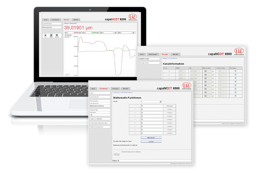 Die Bedienung erfolgt komfortabel über ein integriertes Webinterface, das direkt über einen Webbrowser aufgerufen wird – ganz ohne aufwendige Softwareinstallation. Über die übersichtliche Benutzeroberfläche können Parametrierung, Datenverarbeitung und Visualisierung schnell und einfach durchgeführt werden. Setups können gespeichert und geladen werden, sodass sich die Konfiguration einfach auf weitere Controller übertragen lässt. Bis zu 8 Kanäle können gleichzeitig visualisiert und arithmetisch miteinander verknüpft werden.